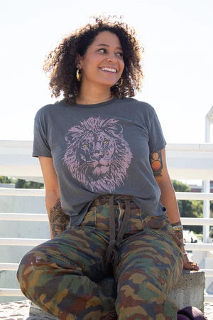 Our "Mane Energy" tee is pure rock and roll - big mane, bold spirit, and just the right flash of yellow in the eyes. Printed in a perfectly faded mauve ink on our vintage black tee, this one’s made to headline your closet!